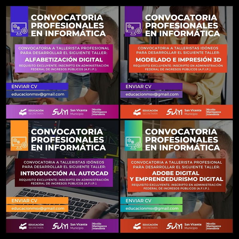 La Secretaría de Educación de la Municipalidad de San Vicente ha lanzado una convocatoria dirigida a profesionales en informática para desarrollar varios talleres en diferentes áreas. Los talleres incluyen temas como Adobe Digital y emprendedurismo digital, introducción al AutoCAD, y modelado e impresión 3D. Se busca a tallleristas idóneos para llevar a cabo estas actividades.