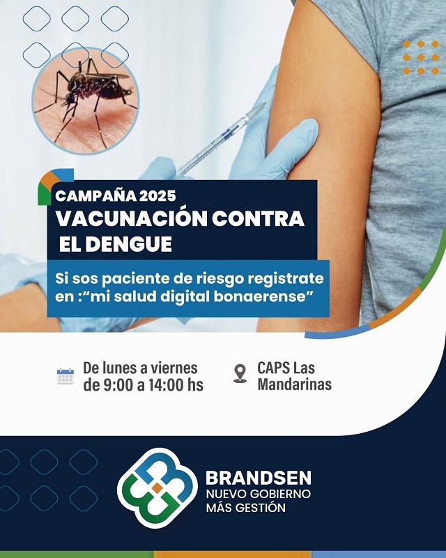 La Municipalidad invita a todos los vecinos que tengan entre 15 y 59 años a vacunarse contra el dengue; aquellos que no hayan tenido la enfermedad y pertenezcan al grupo de riesgo, deberán registrarse en Mi Salud Digital Bonaerense y vía mail recibirán el mail con el turno. Las inoculaciones son en el CAPS Las Mandarinas -Hansen y Azcuénaga-, de lunes a viernes de 9 a 14.
