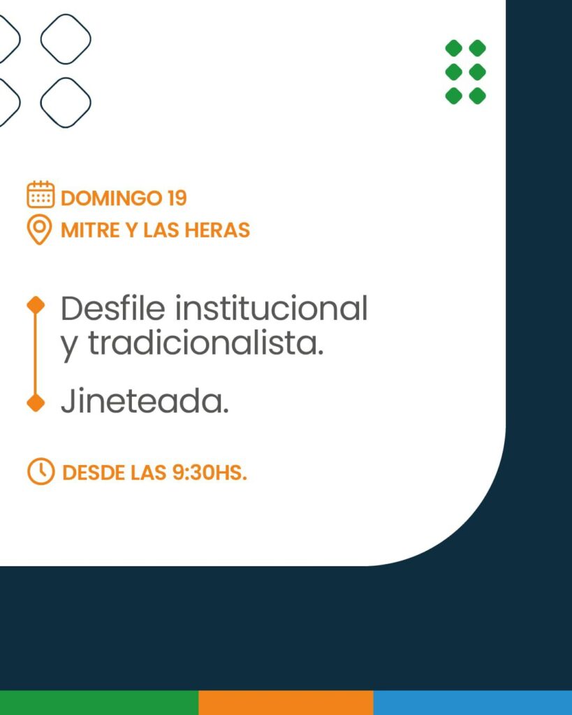 El domingo 19, desde las 10 de la mañana, tendrá lugar el desfile institucional y tradicionalista, seguido por una gran jineteada que reunirá a jinetes y agrupaciones de toda la región.