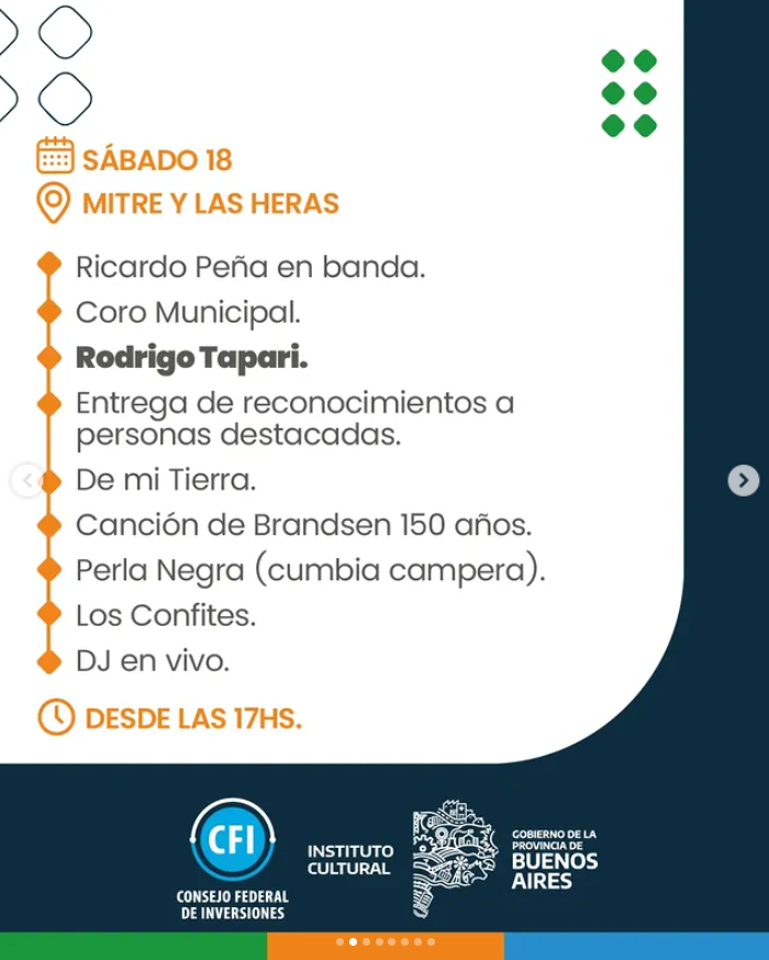 La celebración comenzará el sábado 18 a las 17 horas, en Mitre y Las Heras, con la presentación del Coro Municipal y un show en vivo de Rodrigo Tapari, quien interpretará todos sus éxitos. Durante la jornada también se dará a conocer la canción oficial de los 150 años de Brandsen, y la música seguirá con la cumbia familiar de Perla Negra y Confites, para cerrar la noche con DJ en vivo.