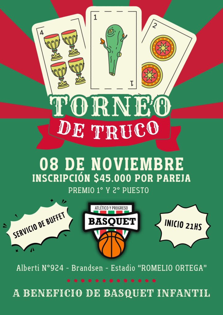 El evento se realizará a beneficio del equipo de básquet infantil y tendrá lugar en Alberti N° 924. El mismo contará con servicio de Buffet y la inscripción tiene un valor de $45.000 por pareja. Los premiados serán el 1° y ° puesto.