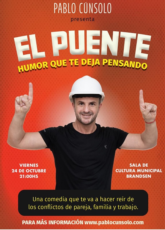 Este viernes 24 de octubre a las 21, el experto en Neurocomunicación Pablo Cunsolo, presentará en la Sala de Cultura Municipal con su comedia unipersonal El Puente (humor que te deja pensando), que fomenta y divulga de forma divertida la importancia de la comunicación en relaciones personales y laborales.