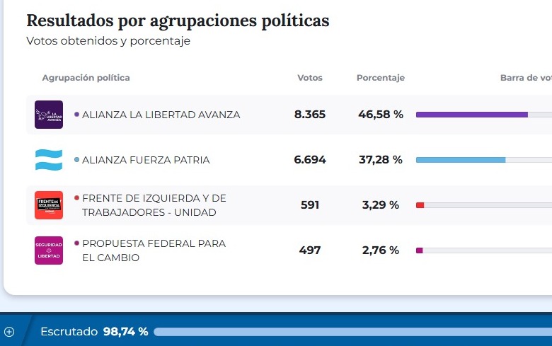 El espacio libertario alcanza más de 8.300 votos, superando ampliamente a Fuerza Patria, que ronda los 6.700 sufragios, mientras que las demás agrupaciones obtienen resultados menores al 5% del total.