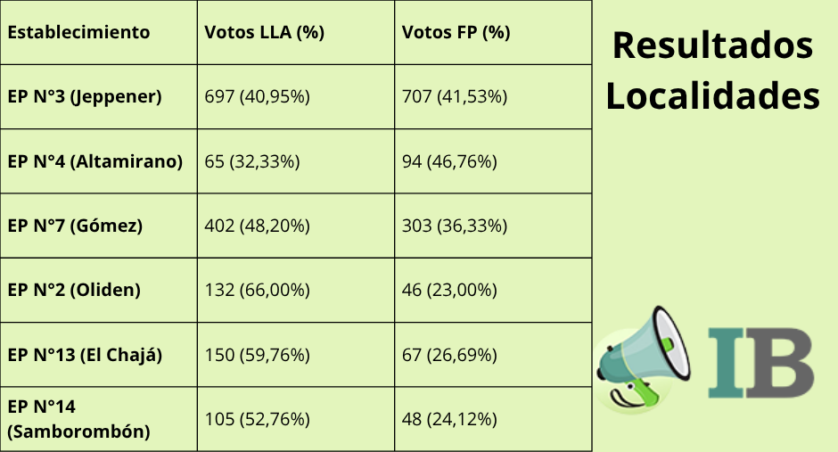 Los resultados en los pueblos arrojaron triunfos para Fuerza Patria tan solo en Jeppener y en Altamirano; el resto fue para La Libertad Avanza, siendo Oliden la que reflejó la diferencia más significativa en todo el Distrito a favor de los libertarios. Fuera de la ciudad cabecera LLA sacó 1551 votos, mientras que el peronismo contabilizó 1265 sufragios.