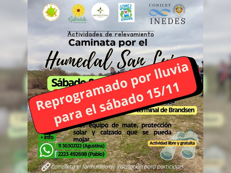 Las actividades programadas para recorrer el humedal San Luís fueron reprogramadas para el próximo sábado 15 a causa del mal clima. «Las lluvias nos impiden ingresar al campo que nos abrirá sus puertas», manifestaron desde la organiación, por lo que el evento deberá esperar una semana más.