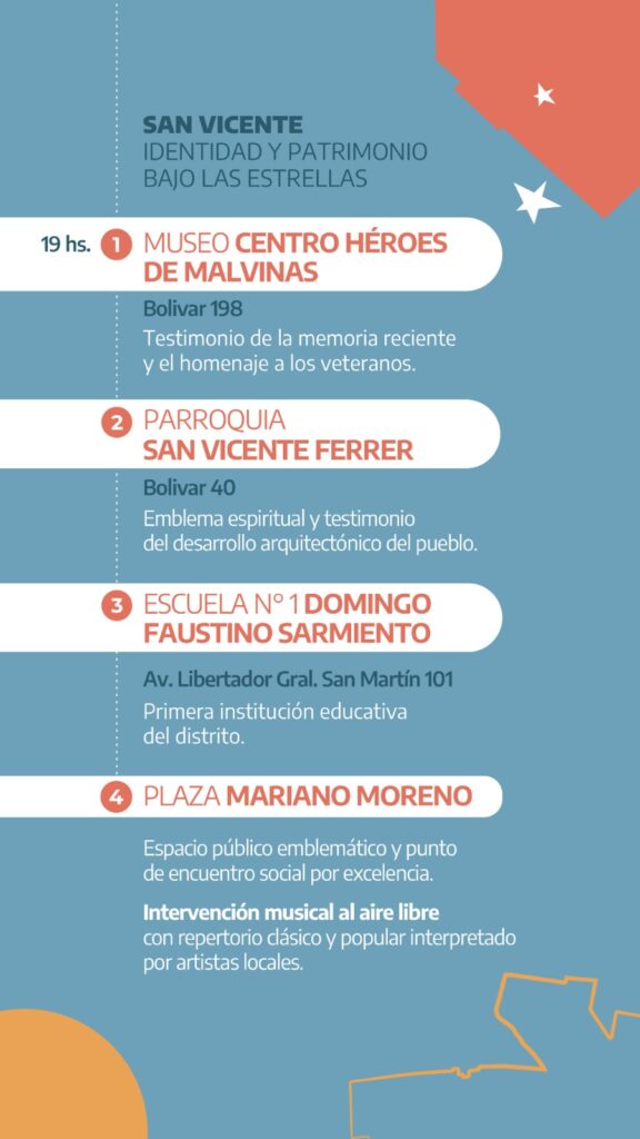 Con esta nueva edición de “Una Noche en los Museos”, San Vicente reafirma su compromiso con la valorización del patrimonio local, la difusión de la cultura y el encuentro de la comunidad en torno a los espacios que conforman su historia e identidad.