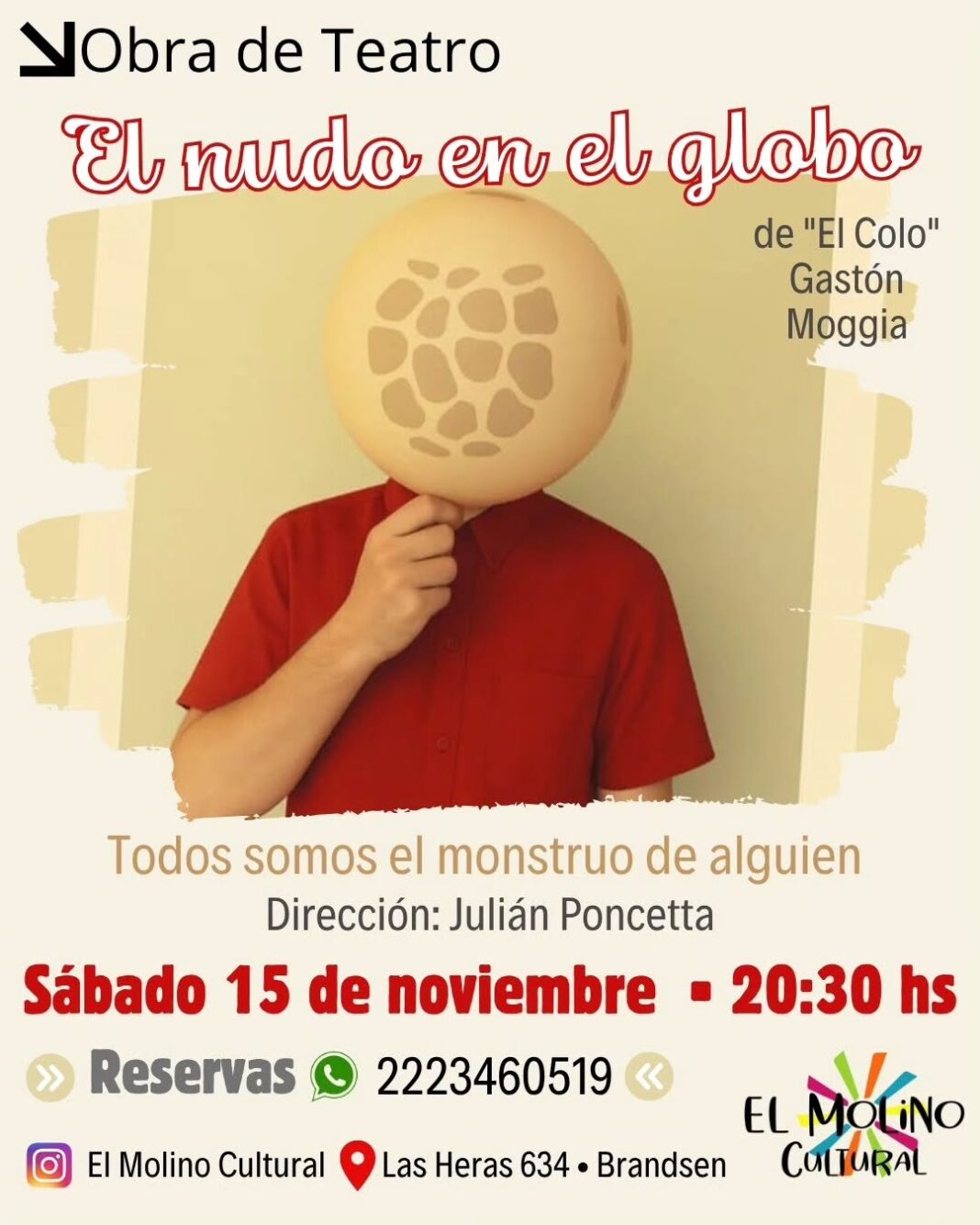 El próximo sábado 15 de noviembre a las 20:30, el Molino Cultural,ubicado en Las Heras N° 634, será escenario de este unipersonal que invita a reflexionar sobre los vínculos familiares, los mandatos heredados y las tensiones entre generaciones.