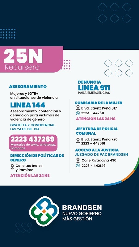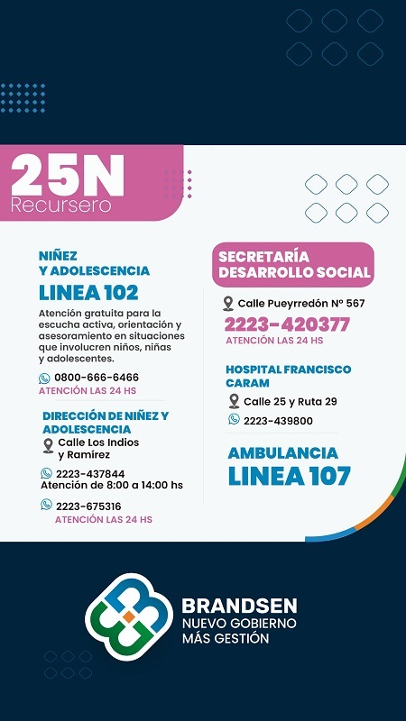 - Dirección de Políticas de Género: Atención las 24 hs en Calle Los Indios y Ramírez. Teléfono local: 2223-437289 (Recibe llamadas y WhatsApp).