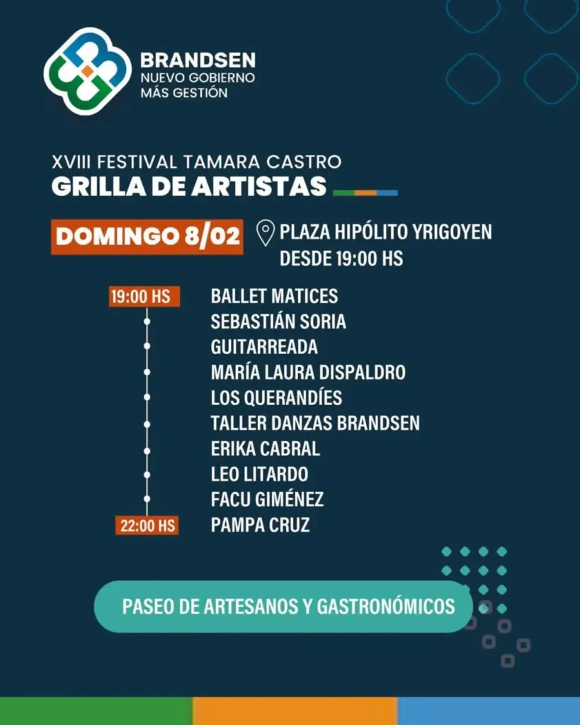 El sábado 7 y domingo 8 de febrero llega el XVIII Festival Tamara Castro, un encuentro que ya es parte de la identidad de Brandsen y que rinde homenaje a nuestra querida Tamara, símbolo de la cultura popular y el sentir de nuestro pueblo.