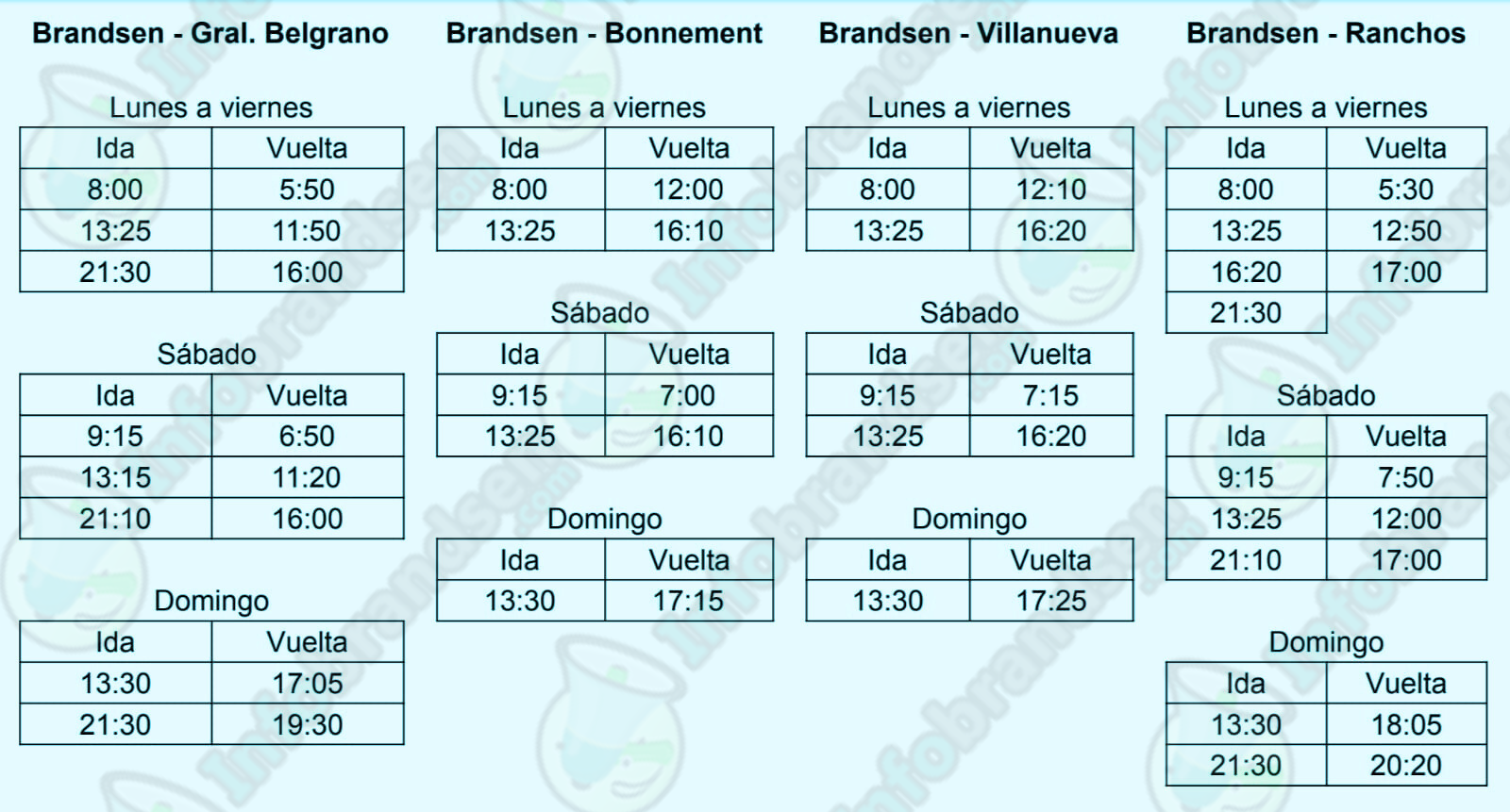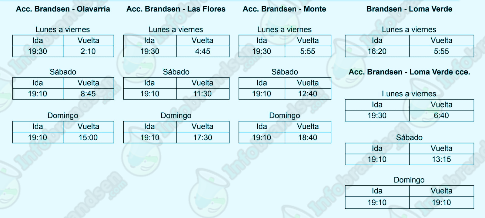 Cronograma y tarifas de los servicios desde y hacia Brandsen. Datos brindados por la empresa.