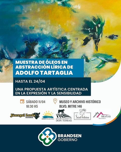 El Museo y Archivo Histórico de Brandsen inaugura una nueva propuesta con la muestra de óleos en abstracción lírica del artista Adolfo Tartaglia. La apertura se realizará el sábado 11 a las 18.30 en la sede del museo, ubicada en Mitre 146 y podrá visitarse hasta el viernes 24.