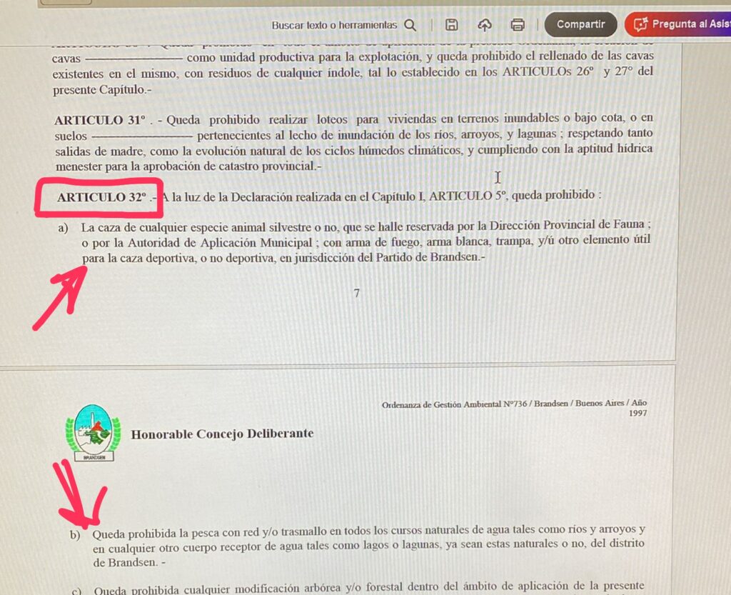 Además, remarcan que estas prácticas se estarían realizando en cercanías de un arroyo protegido por normativa municipal, lo que agrava la situación. En la documentación aportada, se señala que la ordenanza local prohíbe expresamente la caza de fauna silvestre en el distrito, así como ciertas actividades en cursos de agua.